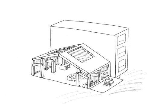 This is the conceptual design of The Inside-out House, a house of which inside and outside become one. The house, having an apparently conventional design when 'closed', consists of series of pantograph roof trusses on both left and right side of the house. These pantograph roof trusses are constructed as movable linkages and are designed such that the mass of the roof and the mass of the walls are balanced with respect to one another. Therefore the top of the roof can be pulled down with minimal effort, having the walls move up such that the house opens itself to the surroundings. By opening the two large bascule windows in the roof, which are balanced by themselves, a passage is created from one side of the house to the other.